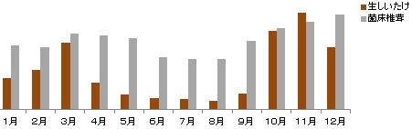おがくずや木のくずと養分を固めたものに菌を植えて栽培する。 |